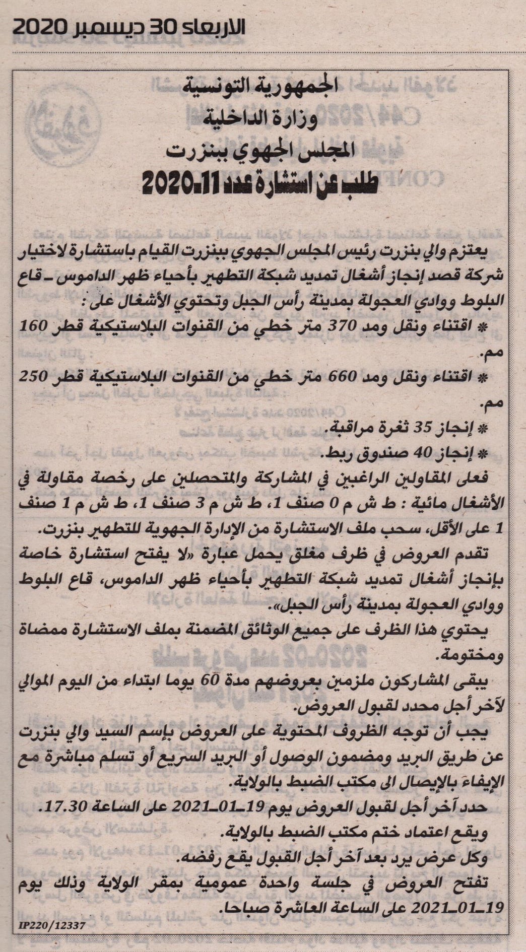 • استشارة لاختيار شركة قصد انجاز اشغال تمديد شبك التطهير بمدينة راس الجبل