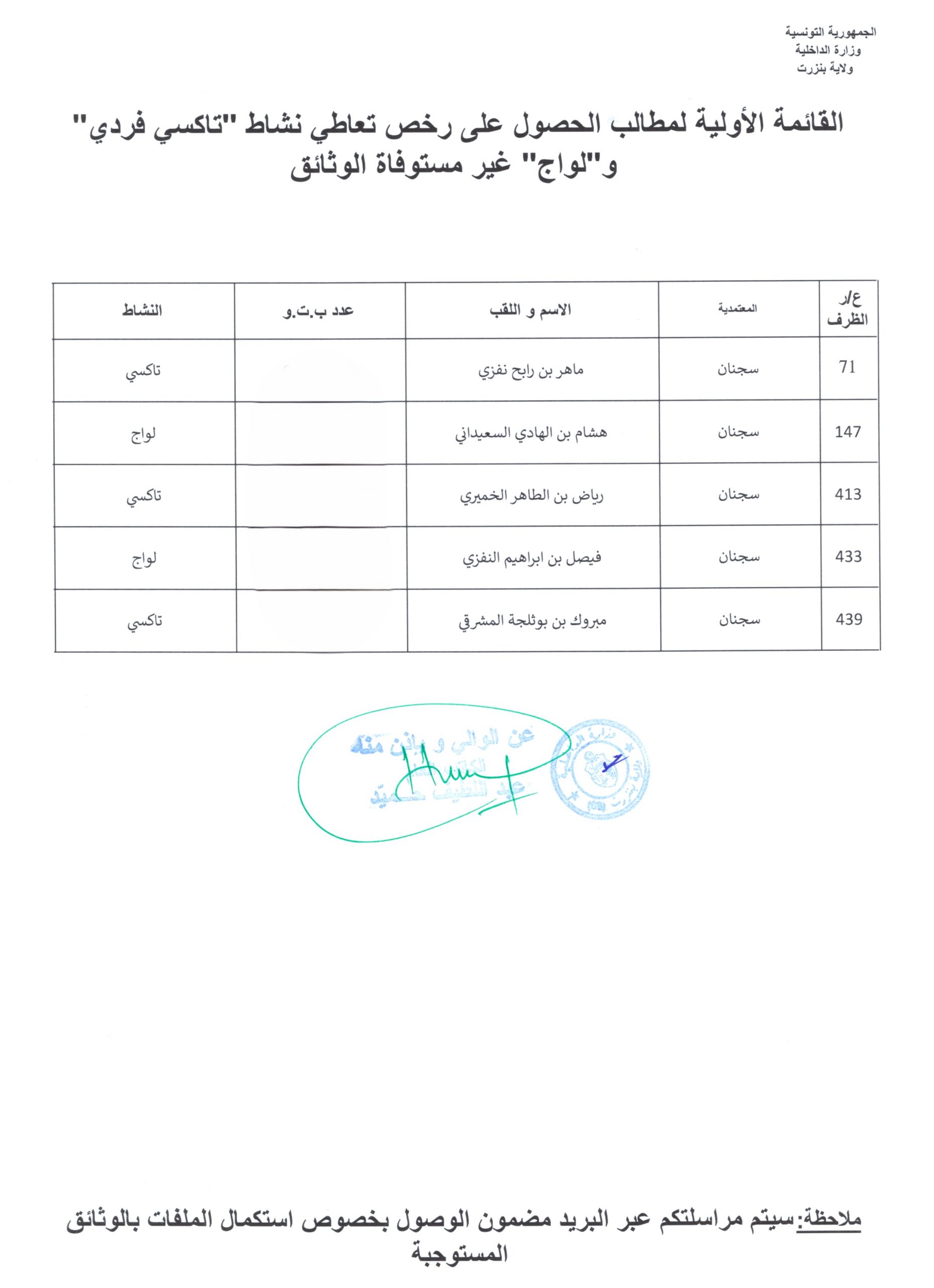 بلاغاتنشاط ** القائمة الأولية لمطالب الحصول على رخصة تعاطي نشاط ” تاكسي فردي ” و” لواج ” غير المستوفاة الوثائق بمعتمدية بسجنان في فبراير 18, 2026 0 عدد المشاهدات : 49 0 Share