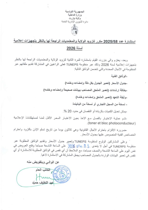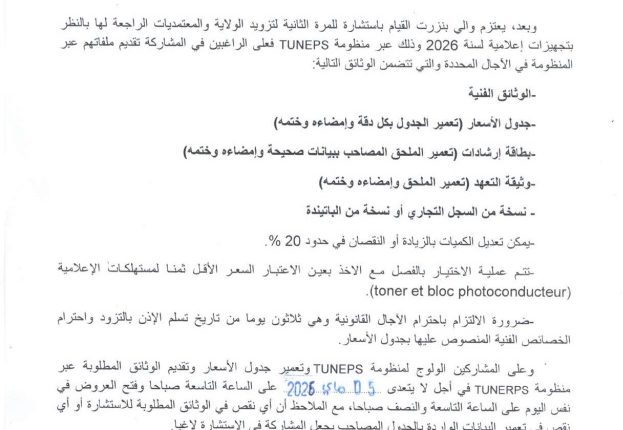 طلبات عروضنشاط * إستشارة عدد 2025/58 مكرر لتزويد الولاية و المعتمديات الراجعة لها بالنظر بتجهيزات إعلامية لسنة 2026 في أبريل 27, 2026 0 عدد المشاهدات : 23 0 Share