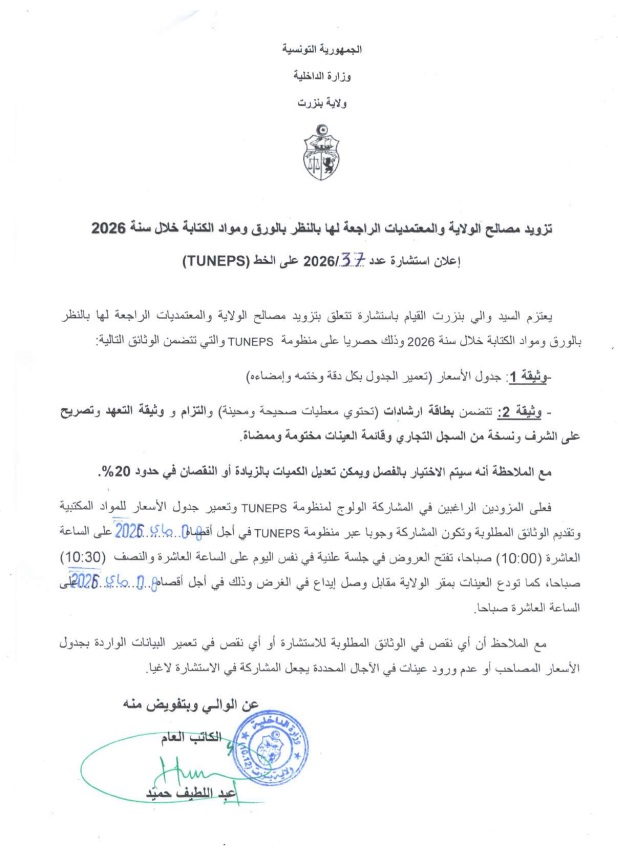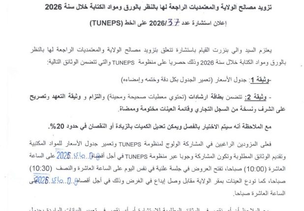 طلبات عروضنشاط * تزويد مصالح الولاية و المعتمديات الراجعة لها بالنظر بالورق و مواد الكتابة خلال سنة 2026 ( اعلان استشارة عدد 2026/37 على خط (TUNEPS) في أبريل 27, 2026 0 عدد المشاهدات : 21 0 Share